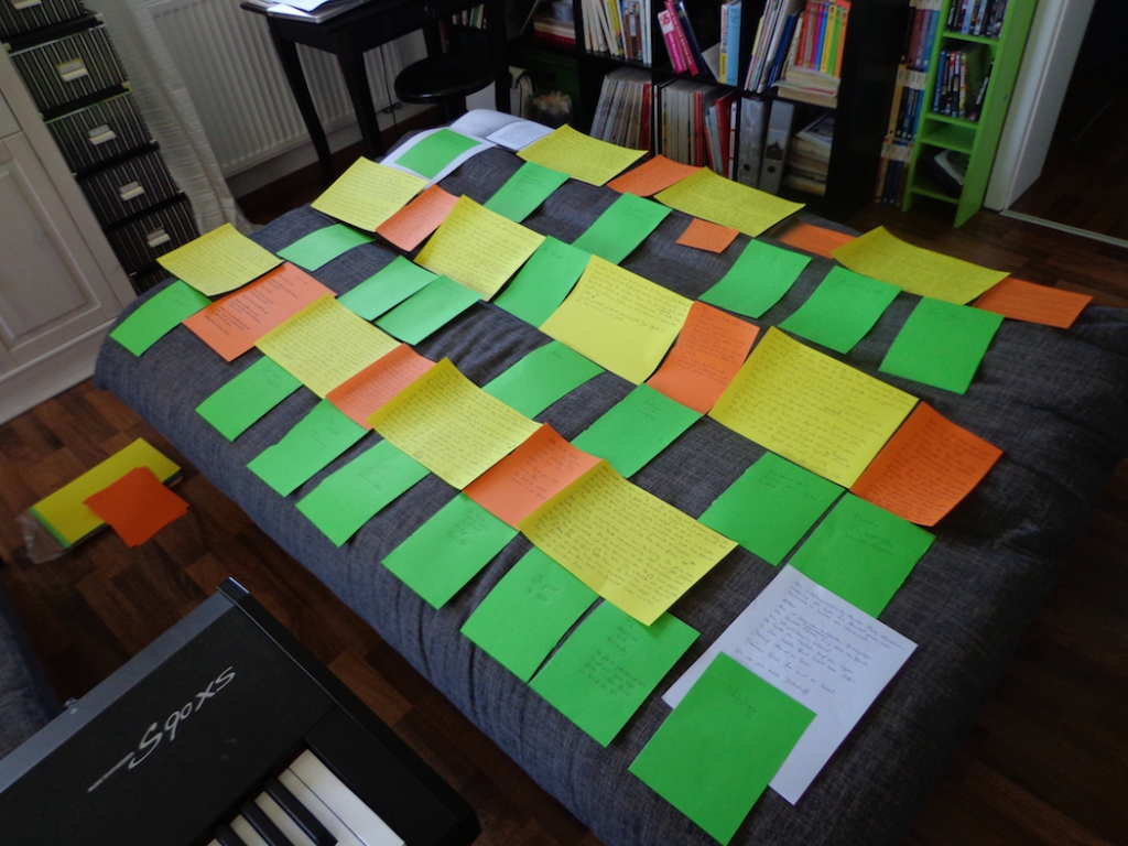 Liebe Freunde, es war wie eine langerwartete Geburt. Nun liegt das neue Baby vor mir auf meinem Sofa. Wen es interessiert: Gelb sind die fortlaufenden Storyelemente, Orange Dialoge und jeder grüne Zettel bedeutet einen Song ;O)). So wie es ausschaut werden es wohl 2 CD´s werden und live, nun das sind sicher mindestens 2 Stunden Phantasie.;O))