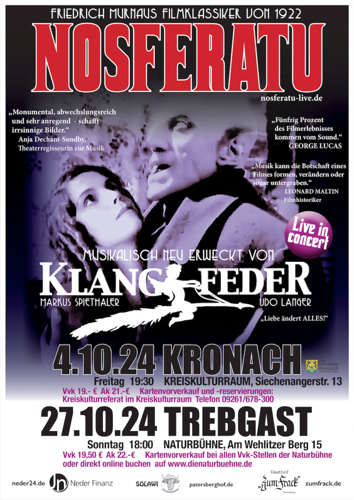 Hier der Link dazu https://m.obermain.de/lokal/altenkunstadt-burgkunstadt-weismain/stummfilm-nosferatu-vertont-grosses-kino-von-udo-langer;art2415,1318646?fbclid=IwY2xjawEtxxZleHRuA2FlbQIxMQABHcd074dKG0dMOEi0KxuGB9znkvT9U5IEgWm-lx4iOW2onfJlcuiC0sAkEQ_aem_dBUnnv_yA9kz6mWoDeNOdA